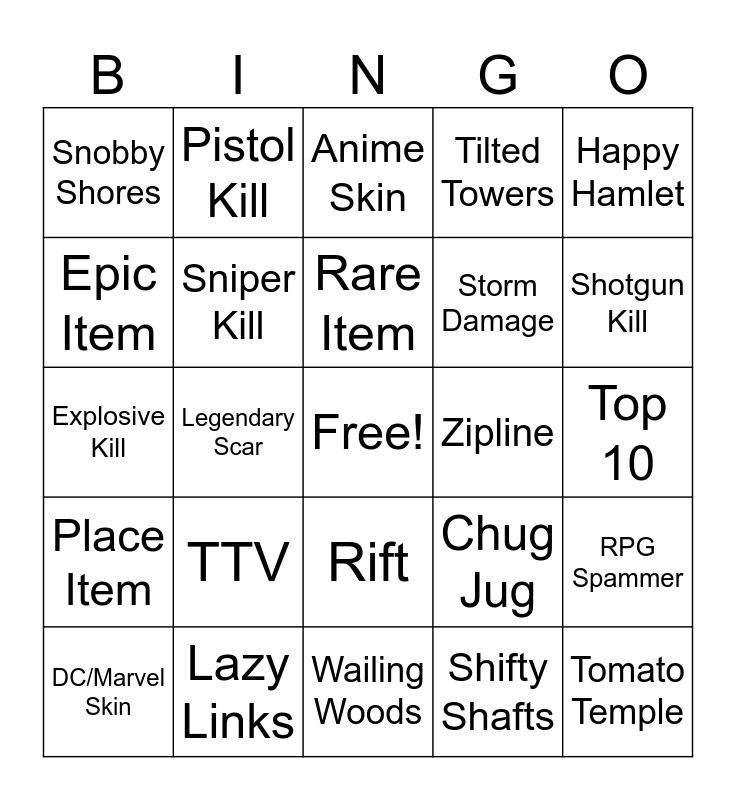 This bingo card has a free space and 74 words: Chest, Ammo Box, Anime Skin, Star Wars Skin, Celebrity Skin, TV/Movie Skin, Emote, OG Skin, DC/Marvel Skin, Holiday Skin, Common Item, Uncommon Item, Rare Item, Epic Item, Legendary Item, Legendary Scar, AR Kill, Shotgun Kill, SMG Kill, Explosive Kill, Sniper Kill, Pistol Kill, Tilted Towers, Soccer Stadium, Tomato Temple, Risky Reels, Pleasant Park, Paradise Palms, Fatal Fields, Lucky Landing, Happy Hamlet, Salty Springs, Retail Row, Dusty Divot, Loot Lake, Shifty Shafts, Polar Peak, Frosty Flights, Race Track, Lonely Lodge, Wailing Woods, Lazy Links, Motel, Junk Junction, Haunted Hills, Snobby Shores, Viking Village, TTV, Anonymous, Bot, Vending Machine, Apple/Mushroom, Top 10, Top 5, 2nd, Victory Royale, Rift, Vehicle, Port-a-Fort, RPG Spammer, Storm Damage, Fall Damage, Place Item, 5+ Kills, Zipline, Gliders, Mini Shield, Big Pot, Chug Jug, Med Kit, Slurp Juice, Supply Drop, AFK and Sidekick.