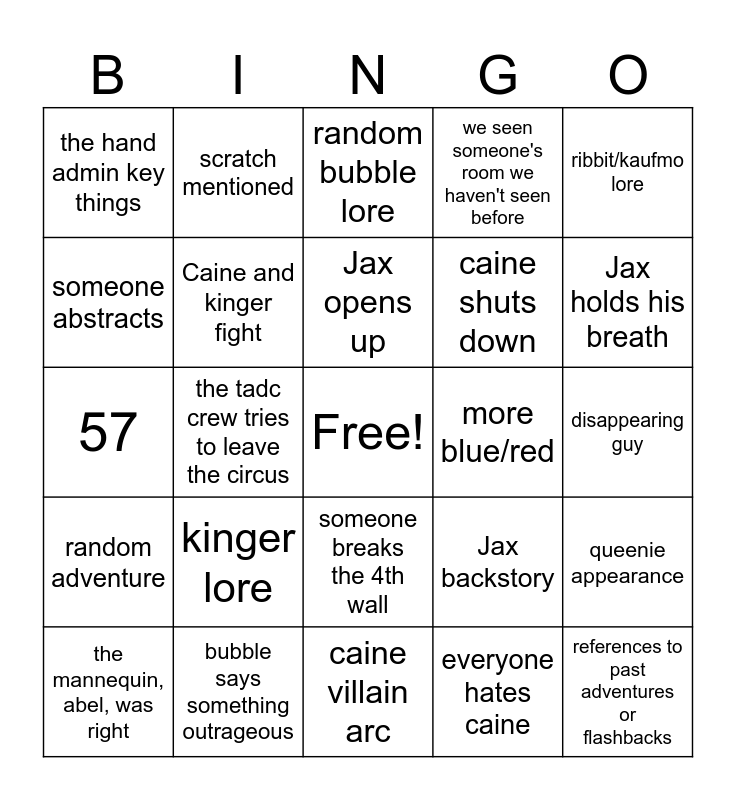 This bingo card has a free space and 24 words: kinger lore, bubble says something outrageous, Jax opens up, the mannequin, abel, was right, ribbit/kaufmo lore, the hand admin key things, someone abstracts, scratch mentioned, more blue/red, someone breaks the 4th wall, caine shuts down, 57, Jax backstory, queenie appearance, Caine and kinger fight, everyone hates caine, disappearing guy, random bubble lore, Jax holds his breath, the tadc crew tries to leave the circus, references to past adventures or flashbacks, random adventure, we seen someone's room we haven't seen before and caine villain arc.