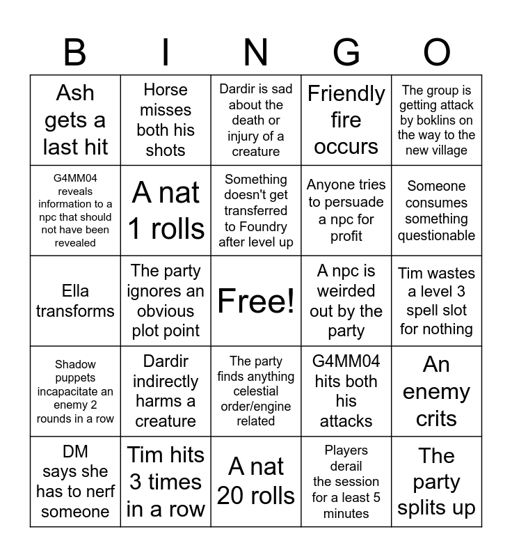 This bingo card has a free space and 24 words: Dardir indirectly harms a creature, Tim hits 3 times in a row, Something doesn't get transferred to Foundry after level up, DM says she has to nerf someone, The group is getting attack by boklins on the way to the new village, Ash gets a last hit, G4MM04 reveals information to a npc that should not have been revealed, Horse misses both his shots, A npc is weirded out by the party, The party finds anything celestial order/engine related, Anyone tries to persuade a npc for profit, Ella transforms, G4MM04 hits both his attacks, An enemy crits, A nat 1 rolls, Players derail the session for a least 5 minutes, Tim wastes a level 3 spell slot for nothing, Dardir is sad about the death or injury of a creature, Someone consumes something questionable, The party ignores an obvious plot point, The party splits up, Shadow puppets incapacitate an enemy 2 rounds in a row, Friendly fire occurs and A nat 20 rolls.