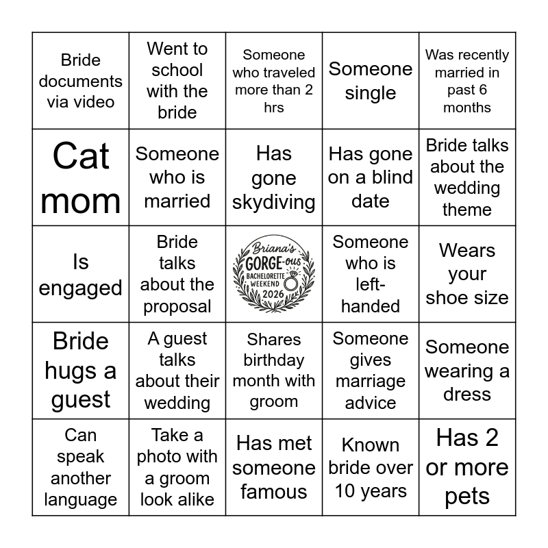 This bingo card has a free space and 30 words: Take a photo with a groom look alike, Bride talking about how they first met, Bride talks about the proposal, Bride shows off her ring, Bride documents via video, Someone who traveled more than 2 hrs, Someone who is married, Shares birthday month with groom, Someone who is left-handed, Has met someone famous, Wears your shoe size, Has 2 or more pets, Known bride over 10 years, Groom is talked about, Bride talks about the wedding theme, Bride talks about the venue, Someone gives marriage advice, Bride hugs a guest, A guest talks about their wedding, Was recently married in past 6 months, Is engaged, Has gone on a Tinder date, Went to school with the bride, Has gone on a blind date, Cat mom, Someone single, Someone wearing a dress, Can speak another language, Has gone skydiving and Has had surgery.