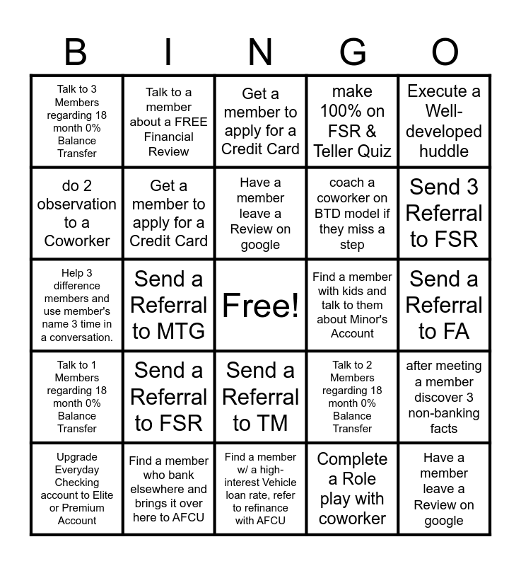 This bingo card has a free space and 24 words: Send a Referral to FSR, Find a member who bank elsewhere and brings it over here to AFCU, Have a member leave a Review on google, Upgrade Everyday Checking account to Elite or Premium Account, Execute a Well-developed huddle, Talk to 3 Members regarding 18 month 0% Balance Transfer, do 2 observation to a Coworker, Talk to a member about a FREE Financial Review, Find a member with kids and talk to them about Minor's Account, Send a Referral to TM, coach a coworker on BTD model if they miss a step, Help 3 difference members and use member's name 3 time in a conversation., Talk to 2 Members regarding 18 month 0% Balance Transfer, after meeting a member discover 3 non-banking facts, Get a member to apply for a Credit Card, Complete a Role play with coworker, Send a Referral to FA, Get a member to apply for a Credit Card, Send 3 Referral to FSR, Send a Referral to MTG, Have a member leave a Review on google, Talk to 1 Members regarding 18 month 0% Balance Transfer, make 100% on FSR & Teller Quiz and Find a member w/ a high-interest Vehicle loan rate, refer to refinance with AFCU.