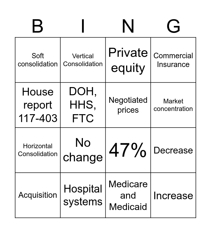 This bingo card has 19 words: 47%, 42%, Private equity, Increase, Decrease, House report 117-403, Medicare and Medicaid, Soft consolidation, Vertical Consolidation, Horizontal Consolidation, No change, DOH, HHS, FTC, Negotiated prices, Hospital systems, Acquisition, Administrative Functions, Commercial Insurance, Market concentration and Patient access.