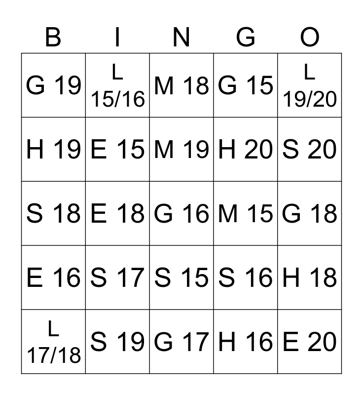 This bingo card has 33 words: E 20, E 19, E 18, E 17, E 16, E 15, L 19/20, L 17/18, L 15/16, M 20, M 19, M 18, M 17, M 16, M 15, S 20, S 19, S 18, S 17, S 16, S 15, G 20, G 19, G 18, G 17, G 16, G 15, H 20, H 19, H 18, H 17, H 16 and H 15.