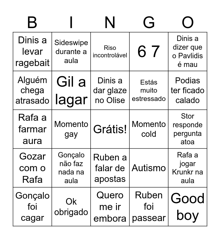 This bingo card has a free space and 24 words: Gonçalo foi cagar, Gonçalo não faz nada na aula, Dinis a dar glaze no Olise, Ruben foi passear, Dinis a dizer que o Pavlidis é mau, Dinis a levar ragebait, Sideswipe durante a aula, Riso incontrolável, Momento cold, Stor responde pergunta atoa, Rafa a farmar aura, Gil a lagar, Autismo, Rafa a jogar Krunkr na aula, Alguém chega atrasado, Ok obrigado, Quero me ir embora, 6 7, Podias ter ficado calado, Gozar com o Rafa, Momento gay, Ruben a falar de apostas, Estás muito estressado and Good boy.