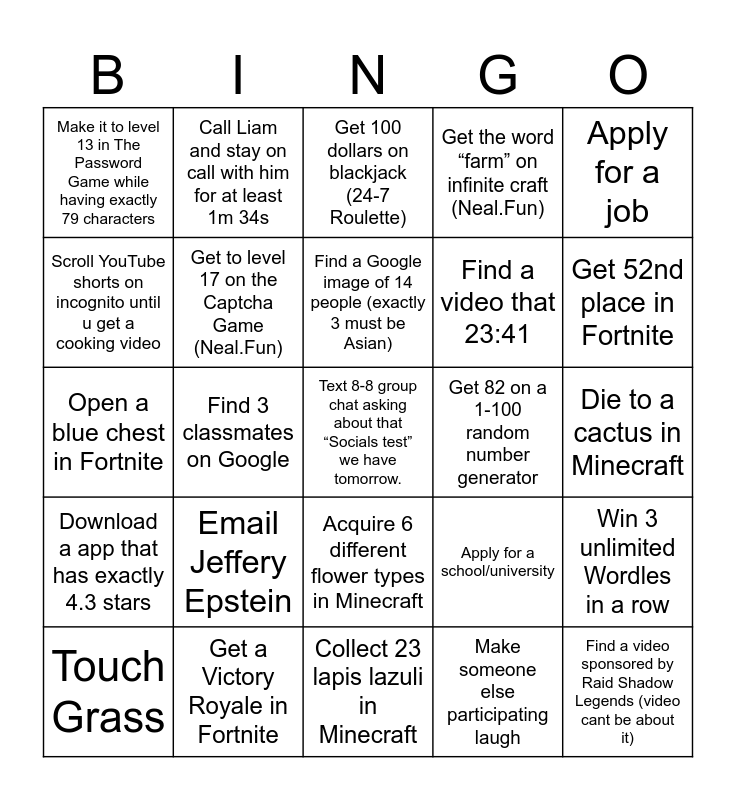 This bingo card has a free space and 24 words: Email Jeffery Epstein, Get a Victory Royale in Fortnite, Find a Google image of 14 people (exactly 3 must be Asian), Touch Grass, Apply for a job, Make it to level 13 in The Password Game while having exactly 79 characters, Scroll YouTube shorts on incognito until u get a cooking video, Call Liam and stay on call with him for at least 1m 34s, Get 82 on a 1-100 random number generator, Acquire 6 different flower types in Minecraft, Find a video that 23:41, Open a blue chest in Fortnite, Apply for a school/university, Win 3 unlimited Wordles in a row, Get to level 17 on the Captcha Game (Neal.Fun), Make someone else participating laugh, Die to a cactus in Minecraft, Get 100 dollars on blackjack (24-7 Roulette), Get 52nd place in Fortnite, Find 3 classmates on Google, Find a video sponsored by Raid Shadow Legends (video cant be about it), Download a app that has exactly 4.3 stars, Get the word “farm” on infinite craft (Neal.Fun) and Collect 23 lapis lazuli in Minecraft.