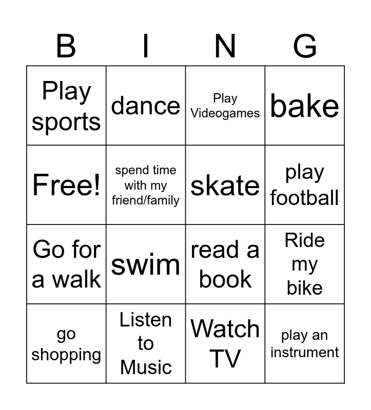 This bingo card has 16 words: Listen to Music, Ride my bike, Play Videogames, Play sports, Go for a walk, dance, read a book, Watch TV, Free!, spend time with my friend/family, go shopping, bake, swim, play football, skate and play an instrument.
