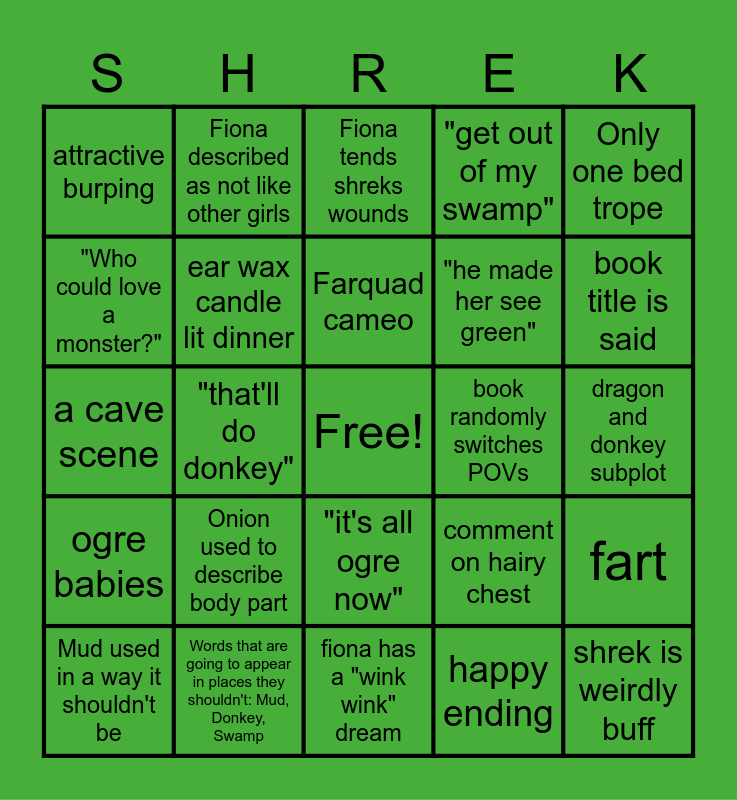 This bingo card has a free space and 24 words: Onion used to describe body part, Words that are going to appear in places they shouldn't: Mud, Donkey, Swamp, Farquad cameo, Mud used in a way it shouldn't be, Only one bed trope, attractive burping, "Who could love a monster?", Fiona described as not like other girls, book randomly switches POVs, "it's all ogre now", "he made her see green", a cave scene, comment on hairy chest, fart, ear wax candle lit dinner, happy ending, dragon and donkey subplot, Fiona tends shreks wounds, book title is said, "that'll do donkey", shrek is weirdly buff, ogre babies, "get out of my swamp" and fiona has a "wink wink" dream.