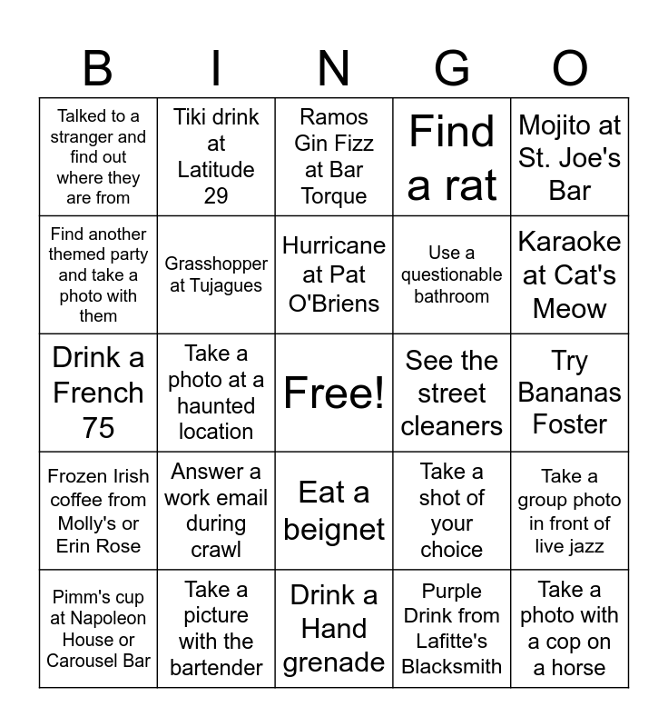 This bingo card has a free space and 24 words: Answer a work email during crawl, Take a picture with the bartender, Hurricane at Pat O'Briens, Pimm's cup at Napoleon House or Carousel Bar, Mojito at St. Joe's Bar, Talked to a stranger and find out where they are from, Find another themed party and take a photo with them, Tiki drink at Latitude 29, See the street cleaners, Eat a beignet, Use a questionable bathroom, Drink a French 75, Take a shot of your choice, Take a group photo in front of live jazz, Grasshopper at Tujagues, Purple Drink from Lafitte's Blacksmith, Try Bananas Foster, Ramos Gin Fizz at Bar Torque, Karaoke at Cat's Meow, Take a photo at a haunted location, Take a photo with a cop on a horse, Frozen Irish coffee from Molly's or Erin Rose, Find a rat and Drink a Hand grenade.