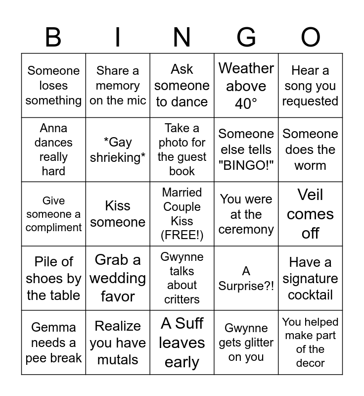 This bingo card has a free space and 24 words: Grab a wedding favor, Realize you have mutals, Take a photo for the guest book, Gemma needs a pee break, Hear a song you requested, Someone loses something, Anna dances really hard, Share a memory on the mic, You were at the ceremony, Gwynne talks about critters, Someone else tells "BINGO!", Give someone a compliment, A Surprise?!, Have a signature cocktail, *Gay shrieking*, Gwynne gets glitter on you, Veil comes off, Ask someone to dance, Someone does the worm, Kiss someone, You helped make part of the decor, Pile of shoes by the table, Weather above 40° and A Suff leaves early.