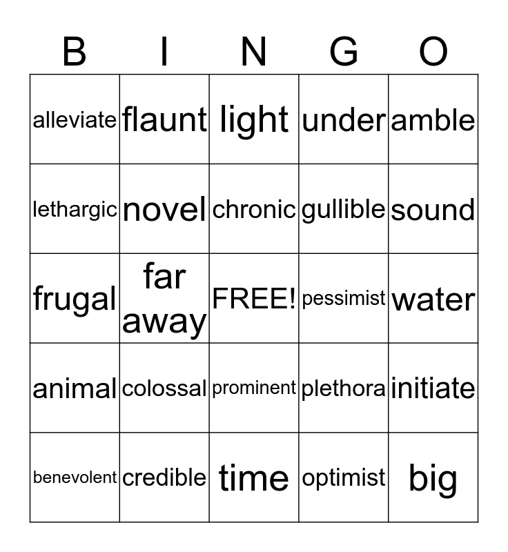 This bingo card has a free space and 24 words: colossal, credible, chronic, benevolent, amble, alleviate, lethargic, flaunt, pessimist, prominent, gullible, frugal, plethora, initiate, novel, optimist, water, light, sound, far away, big, animal, under and time.