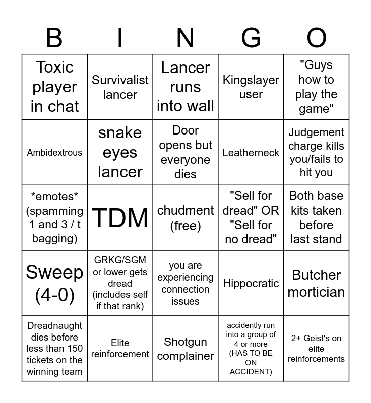 This bingo card has a free space and 44 words: Spawn camping (both sides), 2+ Geist's on elite reinforcements, Dreadnaught clutches battle, Dreadnaught dies before less than 150 tickets on the winning team, KGT/CPL or lower takes kit, accidently run into a group of 4 or more (HAS TO BE ON ACCIDENT), Lancer runs into wall, Parking lot, "Guys how to play the game", Elite reinforcement, Kingslayer user, "Sell for dread" OR "Sell for no dread", you are experiencing connection issues, GRKG/SGM or lower gets dread (includes self if that rank), shock escapes during last stand (not last slop), Shotgun complainer, Soldat asking for ammo (he can give it to himself), *emotes* (spamming 1 and 3 / t bagging), Apparition shotgun, Judgement charge kills you/fails to hit you, Survivalist lancer, 6 of any class or more, Demi human (any animal girl cannot count yourself), Toxic player in chat, No defense at base during last stand, Both base kits taken before last stand, Shock kit steal during tug of war (any side), Shock dies in less than 2-3 minutes, Hippocratic, Sweep (4-0), Jaeger spawn trapping (any side), Butcher mortician, Officer cav sword, Vanknight, TDM, Bad grammar, does speeches, "Can we votekick", Door opens but everyone dies, Ambidextrous, Leatherneck, nobody talks, snake eyes lancer and Jaeger makes "Art"/bicycles.