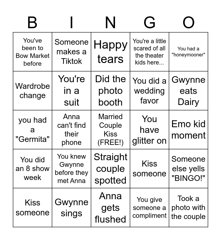 This bingo card has a free space and 24 words: You knew Gwynne before they met Anna, Gwynne sings, Did the photo booth, Kiss someone, You had a "honeymooner", You've been to Bow Market before, Wardrobe change, Someone makes a Tiktok, You have glitter on, Straight couple spotted, You did a wedding favor, you had a "Germita", Kiss someone, Someone else yells "BINGO!", You're in a suit, You give someone a compliment, Emo kid moment, Happy tears, Gwynne eats Dairy, Anna can't find their phone, Took a photo with the couple, You did an 8 show week, You're a little scared of all the theater kids here... and Anna gets flushed.