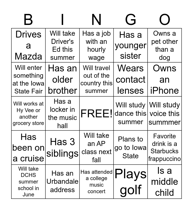 This bingo card has a free space and 24 words: Has 3 siblings, Has an Urbandale address, Will travel out of the country this summer, Will take DCHS summer school in June, Owns a pet other than a dog, Drives a Mazda, Will enter something at the Iowa State Fair, Will take Driver's Ed this summer, Will study dance this summer, Will take an AP class next fall, Wears contact lenses, Will works at Hy Vee or another grocery store, Plans to go to Iowa State, Favorite drink is a Starbucks frappuccino, Has an older brother, Plays golf, Will study voice this summmer, Has a job with an hourly wage, Owns an iPhone, Has a locker in the music hall, Is a middle child, Has been on a cruise, Has a younger sister and Has attended a college music concert.