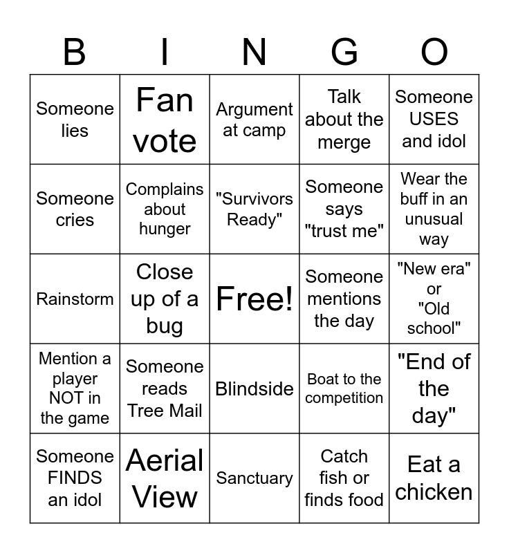 This bingo card has a free space and 24 words: Someone reads Tree Mail, Aerial View, "Survivors Ready", Someone FINDS an idol, Someone USES and idol, Someone lies, Someone cries, Fan vote, Someone mentions the day, Blindside, Someone says "trust me", Rainstorm, Boat to the competition, "End of the day", Complains about hunger, Catch fish or finds food, "New era" or "Old school", Argument at camp, Wear the buff in an unusual way, Close up of a bug, Eat a chicken, Mention a player NOT in the game, Talk about the merge and Sanctuary.