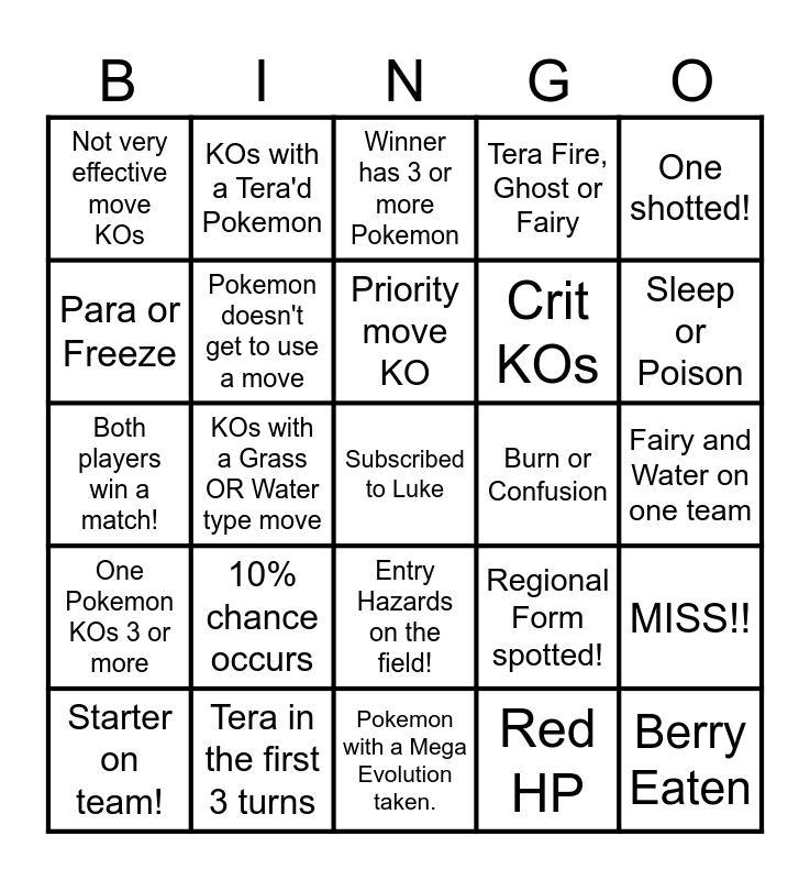 This bingo card has a free space and 24 words: 10% chance occurs, Tera in the first 3 turns, Priority move KO, Starter on team!, One shotted!, Not very effective move KOs, Para or Freeze, KOs with a Tera'd Pokemon, Burn or Confusion, Entry Hazards on the field!, Crit KOs, Both players win a match!, Regional Form spotted!, MISS!!, Pokemon doesn't get to use a move, Red HP, Fairy and Water on one team, Winner has 3 or more Pokemon, Sleep or Poison, KOs with a Grass OR Water type move, Berry Eaten, One Pokemon KOs 3 or more, Tera Fire, Ghost or Fairy and Pokemon with a Mega Evolution taken..