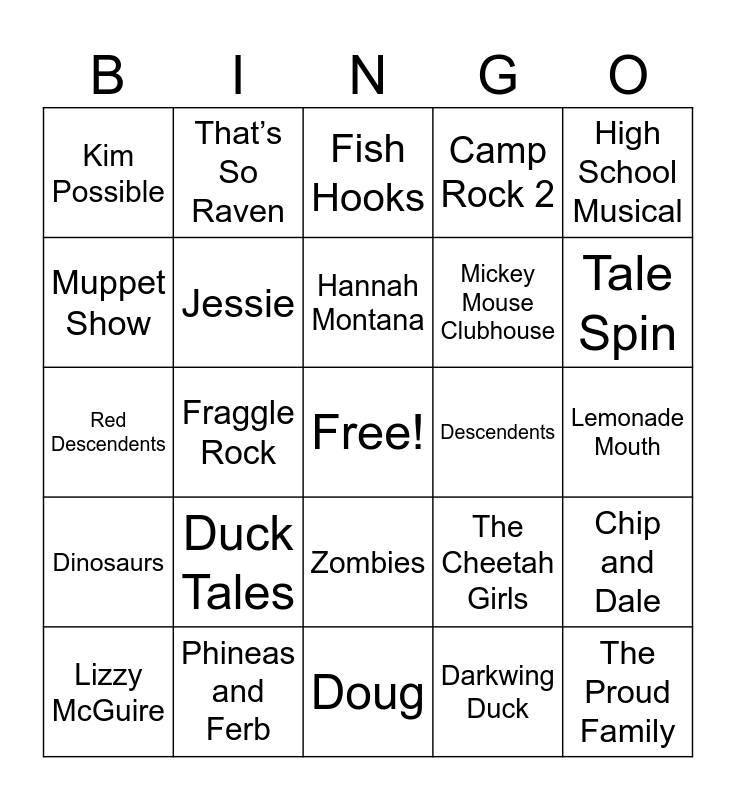 This bingo card has a free space and 24 words: Duck Tales, Phineas and Ferb, Hannah Montana, Lizzy McGuire, High School Musical, Kim Possible, Muppet Show, That’s So Raven, Descendents, Zombies, Mickey Mouse Clubhouse, Red Descendents, The Cheetah Girls, Chip and Dale, Jessie, Darkwing Duck, Lemonade Mouth, Fish Hooks, Tale Spin, Fraggle Rock, The Proud Family, Dinosaurs, Camp Rock 2 and Doug.