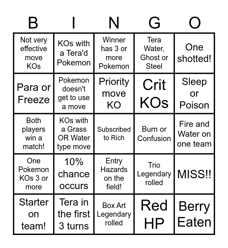 This bingo card has a free space and 24 words: 10% chance occurs, Tera in the first 3 turns, Priority move KO, Starter on team!, One shotted!, Not very effective move KOs, Para or Freeze, KOs with a Tera'd Pokemon, Burn or Confusion, Entry Hazards on the field!, Crit KOs, Both players win a match!, Trio Legendary rolled, MISS!!, Pokemon doesn't get to use a move, Red HP, Fire and Water on one team, Winner has 3 or more Pokemon, Sleep or Poison, KOs with a Grass OR Water type move, Berry Eaten, One Pokemon KOs 3 or more, Tera Water, Ghost or Steel and Box Art Legendary rolled.