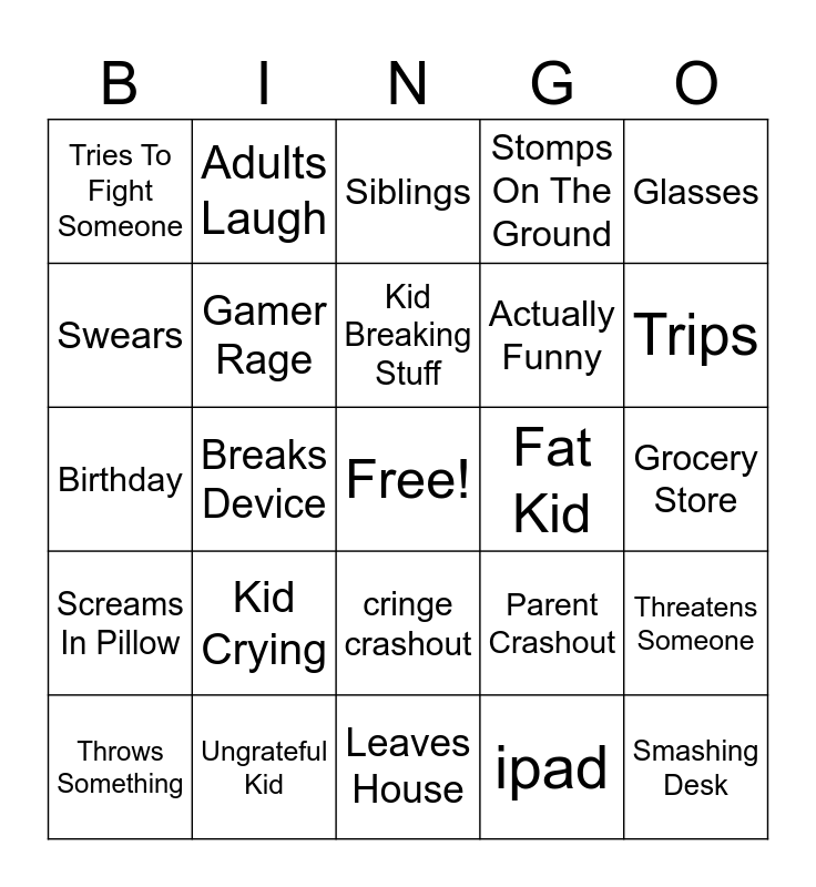 This bingo card has a free space and 24 words: Kid Crying, Ungrateful Kid, Kid Breaking Stuff, Throws Something, Glasses, Tries To Fight Someone, Swears, Adults Laugh, Fat Kid, cringe crashout, Actually Funny, Birthday, Parent Crashout, Threatens Someone, Gamer Rage, ipad, Grocery Store, Siblings, Trips, Breaks Device, Smashing Desk, Screams In Pillow, Stomps On The Ground and Leaves House.