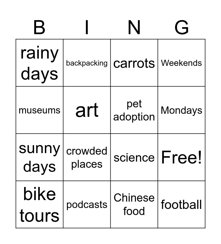 This bingo card has 20 words: Free!, coffee, carrots, healthy food, bike tours, museums, podcasts, rainy days, sunny days, backpacking, crowded places, science, art, football, pet adoption, Kpop, Mondays, Weekends, Chinese food and Disney movies.