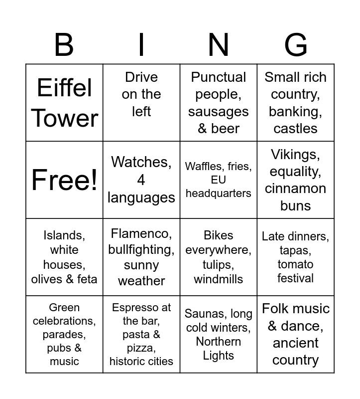 This bingo card has 16 words: Espresso at the bar, pasta & pizza, historic cities, Late dinners, tapas, tomato festival, Punctual people, sausages & beer, Eiffel Tower, Islands, white houses, olives & feta, Drive on the left, Bikes everywhere, tulips, windmills, Saunas, long cold winters, Northern Lights, Free!, Watches, 4 languages, Green celebrations, parades, pubs & music, Small rich country, banking, castles, Flamenco, bullfighting, sunny weather, Vikings, equality, cinnamon buns, Waffles, fries, EU headquarters and Folk music & dance, ancient country.