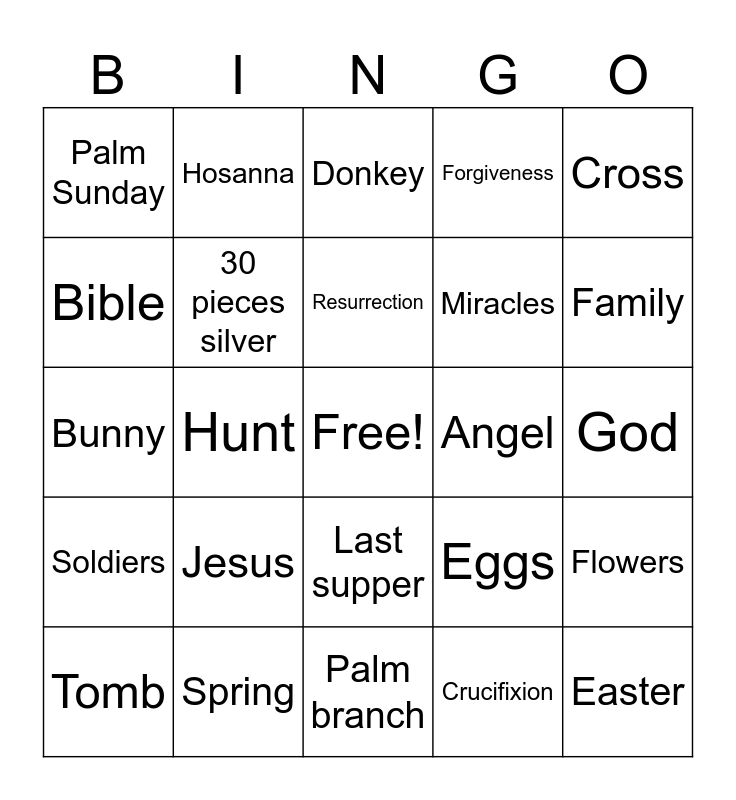 This bingo card has a free space and 24 words: Jesus, Spring, Resurrection, Tomb, Cross, Palm Sunday, Bible, Hosanna, Angel, Last supper, Miracles, Bunny, Eggs, Flowers, 30 pieces silver, Crucifixion, God, Donkey, Family, Hunt, Easter, Soldiers, Forgiveness and Palm branch.
