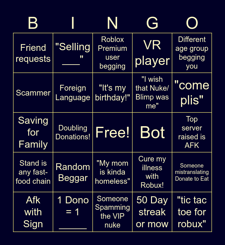 This bingo card has a free space and 24 words: Random Beggar, 1 Dono = 1 _____, "It's my birthday!", Afk with Sign, Different age group begging you, Friend requests, Scammer, "Selling ___", Bot, "My mom is kinda homeless", "I wish that Nuke/ Blimp was me", Saving for Family, Cure my illness with Robux!, Someone mistranslating Donate to Eat, Foreign Language, 50 Day streak or mow, Top server raised is AFK, Roblox Premium user begging, "come plis", Doubling Donations!, "tic tac toe for robux", Stand is any fast-food chain, VR player and Someone Spamming the VIP nuke.