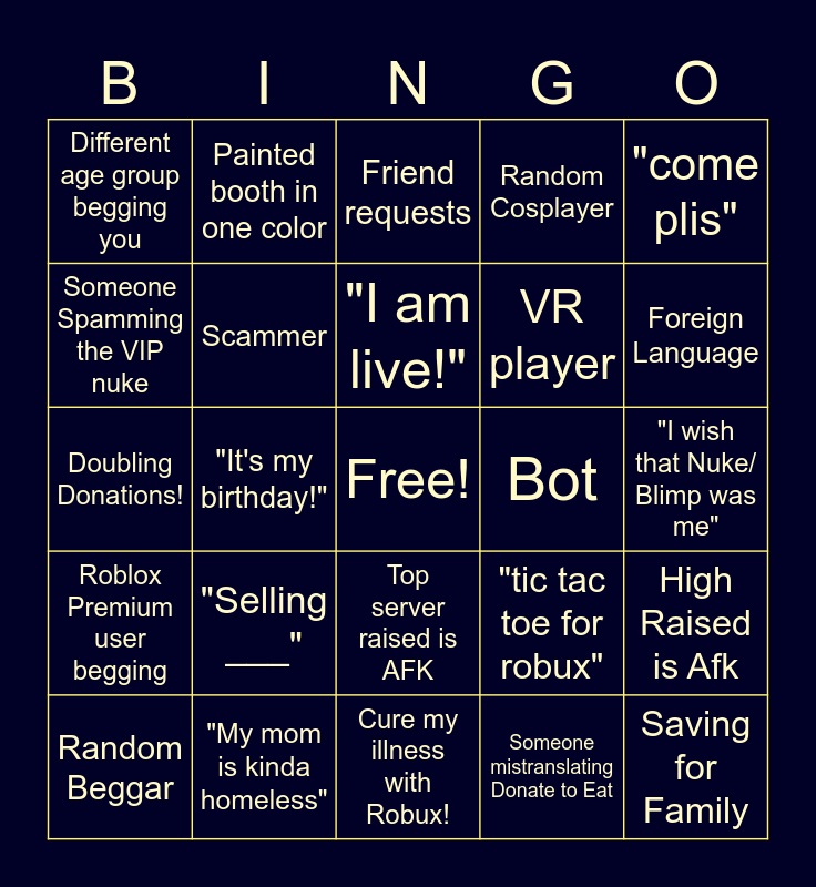 This bingo card has a free space and 29 words: Random Beggar, 1 Dono = 1 _____, "It's my birthday!", Afk with Sign, Different age group begging you, Friend requests, Scammer, "Selling ___", Bot, "My mom is kinda homeless", "I wish that Nuke/ Blimp was me", Saving for Family, Cure my illness with Robux!, Someone mistranslating Donate to Eat, Foreign Language, 50 Day streak or mow, Top server raised is AFK, Roblox Premium user begging, "come plis", Doubling Donations!, "tic tac toe for robux", Stand is any fast-food chain, VR player, Someone Spamming the VIP nuke, Random Cosplayer, Painted booth in one color, High Raised is Afk, "I am live!" and "buying brainrot".