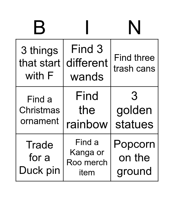 This bingo card has 9 words: Trade for a Duck pin, Find the rainbow, Find three trash cans, 3 things that start with F, Find 3 different wands, 3 golden statues, Find a Christmas ornament, Find a Kanga or Roo merch item and Popcorn on the ground.