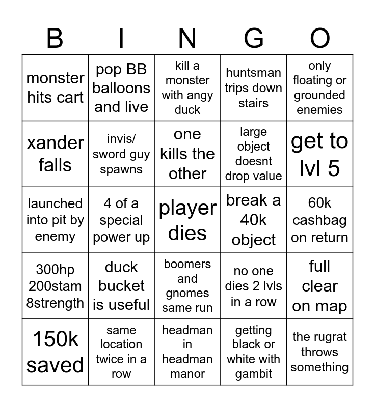 This bingo card has a free space and 24 words: duck bucket is useful, same location twice in a row, one kills the other, 150k saved, only floating or grounded enemies, monster hits cart, xander falls, pop BB balloons and live, break a 40k object, boomers and gnomes same run, large object doesnt drop value, launched into pit by enemy, no one dies 2 lvls in a row, full clear on map, invis/ sword guy spawns, getting black or white with gambit, 60k cashbag on return, kill a monster with angy duck, get to lvl 5, 4 of a special power up, the rugrat throws something, 300hp 200stam 8strength, huntsman trips down stairs and headman in headman manor.