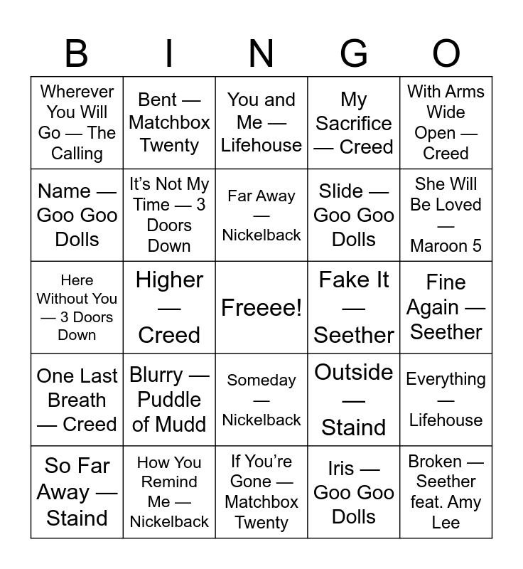 This bingo card has a free space and 40 words: Kryptonite — 3 Doors Down, Here Without You — 3 Doors Down, When I’m Gone — 3 Doors Down, It’s Not My Time — 3 Doors Down, How You Remind Me — Nickelback, Someday — Nickelback, Far Away — Nickelback, Photograph — Nickelback, With Arms Wide Open — Creed, One Last Breath — Creed, Higher — Creed, My Sacrifice — Creed, Broken — Seether feat. Amy Lee, Fine Again — Seether, Fake It — Seether, Blurry — Puddle of Mudd, She Hates Me — Puddle of Mudd, Wherever You Will Go — The Calling, Hanging by a Moment — Lifehouse, You and Me — Lifehouse, Everything — Lifehouse, Iris — Goo Goo Dolls, Slide — Goo Goo Dolls, Name — Goo Goo Dolls, Drive — Incubus, Wish You Were Here — Incubus, The Reason — Hoobastank, Crawling in the Dark — Hoobastank, Lips of an Angel — Hinder, Better Man — Pearl Jam, Last Kiss — Pearl Jam, So Far Away — Staind, It’s Been Awhile — Staind, Outside — Staind, She Will Be Loved — Maroon 5, If You’re Gone — Matchbox Twenty, Unwell — Matchbox Twenty, 3AM — Matchbox Twenty, Bent — Matchbox Twenty and Goodbye to You — Michelle Branch.