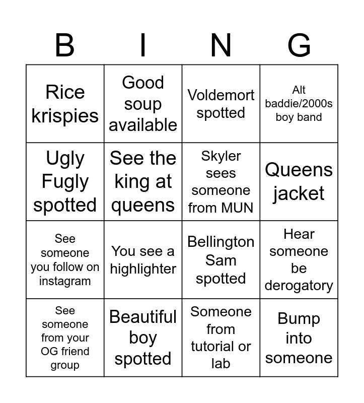 This bingo card has 20 words: Hear someone be derogatory, See someone you went to highschool with, Voldemort spotted, Fortune cookies, See someone from your OG friend group, Ugly Fugly spotted, Beautiful boy spotted, Rice krispies, See someone you follow on instagram, Good soup available, You see a highlighter, Bellington Sam spotted, See the king at queens, Bump into someone, Skyler sees someone from MUN, Someone drops a plate, Queens jacket, Alt baddie/2000s boy band, Someone from tutorial or lab and A masc girl.