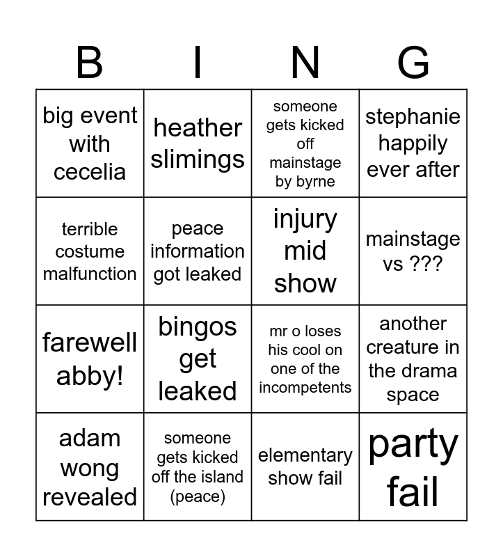 This bingo card has 16 words: someone gets kicked off the island (peace), another creature in the drama space, someone gets kicked off mainstage by byrne, big event with cecelia, farewell abby!, heather slimings, mr o loses his cool on one of the incompetents, elementary show fail, terrible costume malfunction, peace information got leaked, adam wong revealed, stephanie happily ever after, bingos get leaked, mainstage vs ???, injury mid show and party fail.