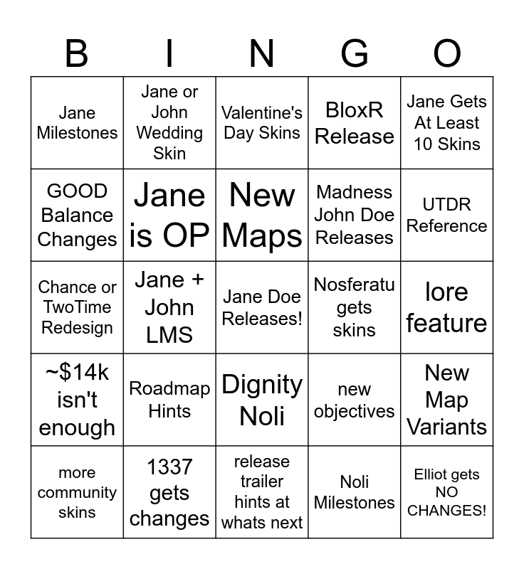 This bingo card has a free space and 24 words: Roadmap Hints, 1337 gets changes, New Maps, more community skins, Jane Gets At Least 10 Skins, Jane Milestones, GOOD Balance Changes, Jane or John Wedding Skin, Nosferatu gets skins, Dignity Noli, Madness John Doe Releases, Chance or TwoTime Redesign, new objectives, New Map Variants, Jane is OP, Noli Milestones, lore feature, Valentine's Day Skins, UTDR Reference, Jane + John LMS, Elliot gets NO CHANGES!, ~$14k isn't enough, BloxR Release and release trailer hints at whats next.