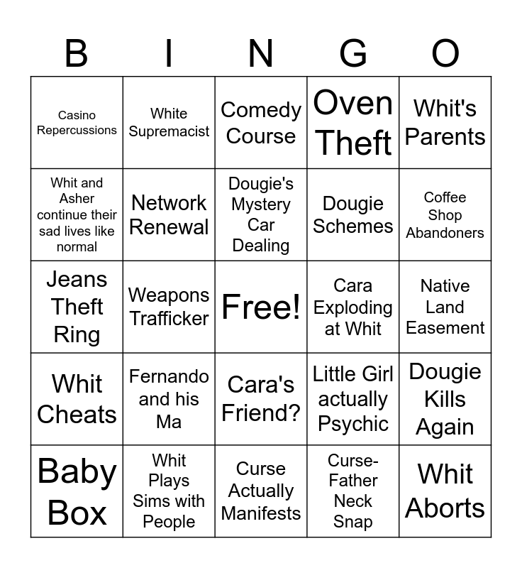 This bingo card has a free space and 24 words: Baby Box, Fernando and his Ma, Dougie's Mystery Car Dealing, Curse-Father Neck Snap, Whit's Parents, Casino Repercussions, White Supremacist, Comedy Course, Cara Exploding at Whit, Native Land Easement, Jeans Theft Ring, Network Renewal, Little Girl actually Psychic, Dougie Kills Again, Whit and Asher continue their sad lives like normal, Whit Plays Sims with People, Curse Actually Manifests, Oven Theft, Coffee Shop Abandoners, Whit Cheats, Weapons Trafficker, Cara's Friend?, Dougie Schemes and Whit Aborts.