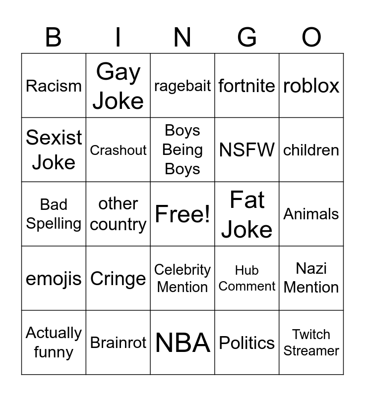 This bingo card has a free space and 24 words: Cringe, Brainrot, Boys Being Boys, Actually funny, roblox, Racism, Sexist Joke, Gay Joke, Fat Joke, Celebrity Mention, NSFW, Bad Spelling, Hub Comment, Nazi Mention, Crashout, Politics, Animals, ragebait, children, other country, Twitch Streamer, emojis, fortnite and NBA.