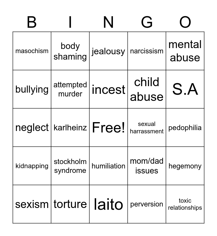 This bingo card has a free space and 24 words: stockholm syndrome, torture, incest, sexism, mental abuse, masochism, bullying, body shaming, sexual harrassment, humiliation, child abuse, neglect, mom/dad issues, hegemony, attempted murder, perversion, pedophilia, jealousy, S.A, karlheinz, toxic relationships, kidnapping, narcissism and laito.