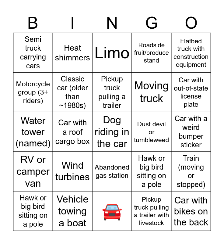 This bingo card has 26 words: RV or camper van, Vehicle towing a boat, Pickup truck pulling a trailer, Pickup truck pulling a trailer with livestock, Flatbed truck with construction equipment, Semi truck carrying cars, Classic car (older than ~1980s), Limo, Moving truck, Car with bikes on the back, Motorcycle group (3+ riders), Car with a roof cargo box, 🚘, Hawk or big bird sitting on a pole, Car with a weird bumper sticker, Giant animal statue (cow, dinosaur, etc.), Heat shimmers, Abandoned gas station, Roadside fruit/produce stand, Train (moving or stopped), Water tower (named), Wind turbines, Dog riding in the car, Dust devil or tumbleweed, Car with out-of-state license plate and Hawk or big bird sitting on a pole.