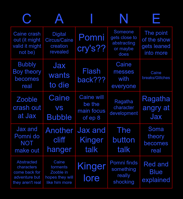 This bingo card has a free space and 24 words: Another cliff hanger, Caine torments Zooble in hopes they will like him more, Flash back???, Abstracted characters come back for adventure but they aren't real, The point of the show gets leaned into more, Caine crash out (it might valid it might not be), Bubbly Boy theory becomes real, Digital Circus/Caine creation revealed, Ragatha character development, Jax and Kinger talk, Caine messes with everyone, Zooble crash out at Jax, The button talk, Soma theory becomes real, Jax wants to die, Pomni finds something really shocking, Ragatha angry at Jax, Pomni cry's??, Caine breaks/Glitches, Caine vs Bubble, Red and Blue explained, Jax and Pomni do NOT make out, Someone gets close to abstracting or maybe does and Kinger lore.