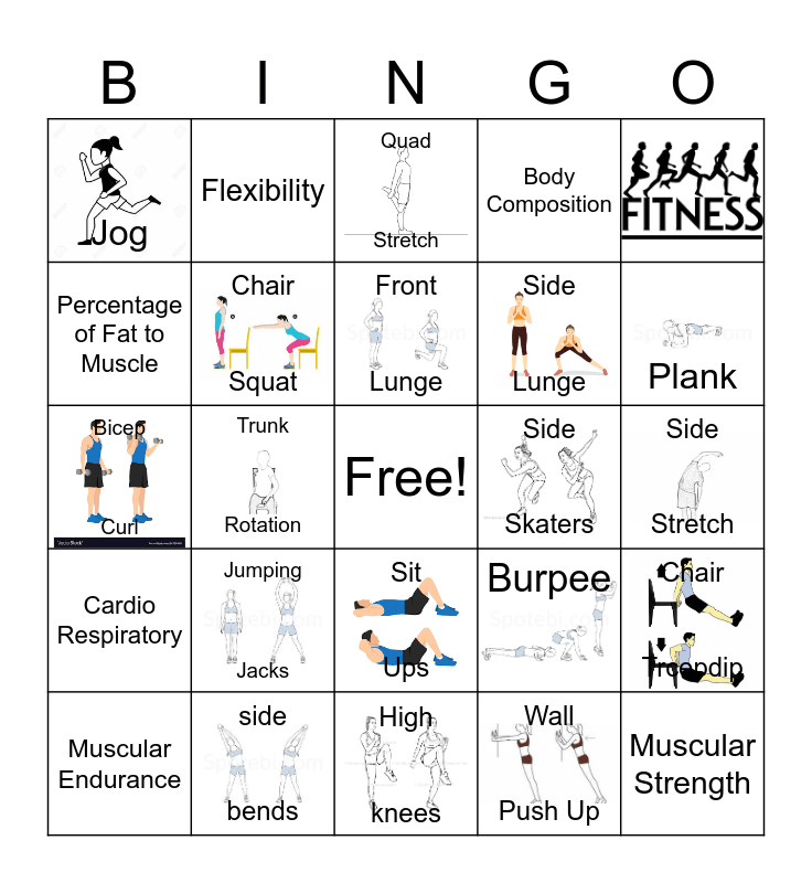 This bingo card has 18 images, a free space and 23 words: Muscular Endurance, Jumping Jacks, Front Lunge, Wall Push Up, Jog, Flexibility, Quad Stretch, Side Skaters, Side Stretch, Bicep Curl, Chair Squat, Burpee, Chair Trcepdip, Percentage of Fat to Muscle, side bends, High knees, Body Composition, Plank, Cardio Respiratory, Trunk Rotation, Sit Ups, Side Lunge and Muscular Strength.