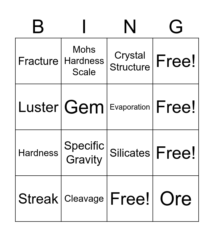 This bingo card has 20 words: Free!, Mineral, Crystal Structure, Color, Streak, Luster, Cleavage, Fracture, Hardness, Mohs Hardness Scale, Specific Gravity, Silicates, Gem, Ore, Evaporation, Cooling of Magma or Lava, Free!, Free!, Free! and Free!.