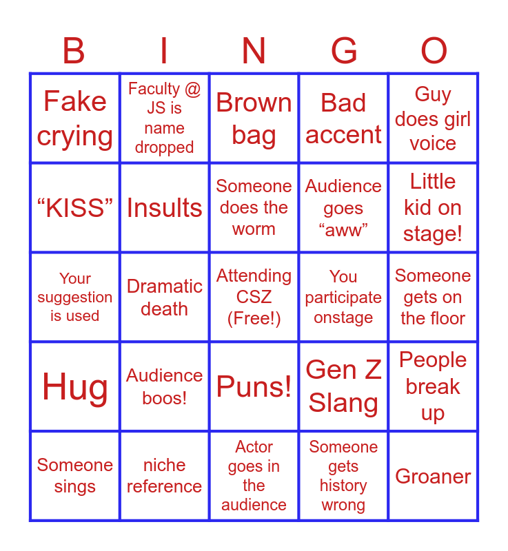 This bingo card has a free space and 24 words: Audience boos!, niche reference, Someone does the worm, Someone sings, Guy does girl voice, Fake crying, “KISS”, Faculty @ JS is name dropped, You participate onstage, Puns!, Audience goes “aww”, Your suggestion is used, Gen Z Slang, People break up, Insults, Someone gets history wrong, Someone gets on the floor, Brown bag, Little kid on stage!, Dramatic death, Groaner, Hug, Bad accent and Actor goes in the audience.