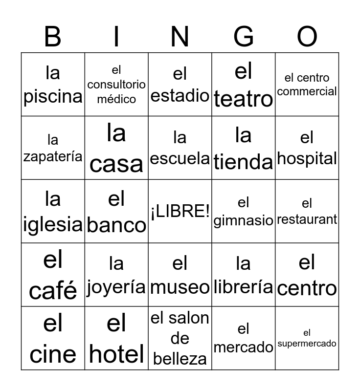 This bingo card has a free space and 33 words: el aeropuerto, el almacén, el banco, la biblioteca, el café, la casa, el centro commercial, el cine, el consultorio médico, el correo, la escuela, el estadio, la farmacia, la gasolinera, el gimnasio, el hospital, el hotel, la iglesia, la joyería, la librería, el museo, el parquet, la piscina, el restaurant, el salon de belleza, el supermercado, el teatro, la tienda, la zapatería, el centro, el hostel, el mercado and la plaza.