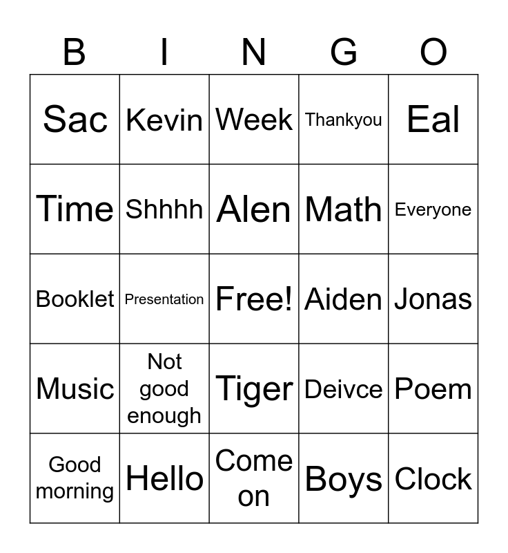 This bingo card has a free space and 24 words: Not good enough, Hello, Alen, Good morning, Eal, Sac, Time, Kevin, Aiden, Tiger, Math, Booklet, Deivce, Poem, Shhhh, Boys, Jonas, Week, Everyone, Presentation, Clock, Music, Thankyou and Come on.
