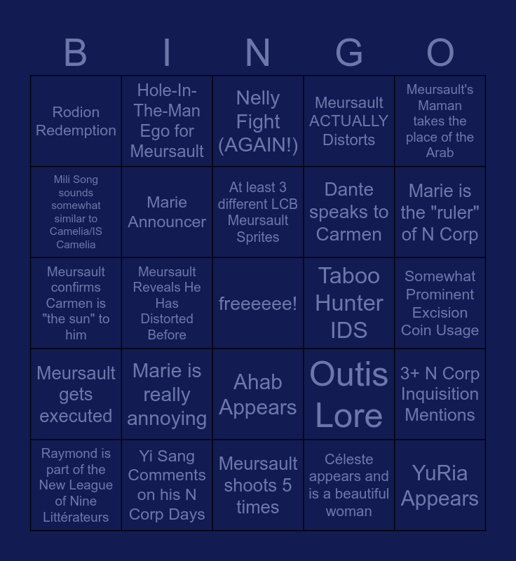 This bingo card has a free space and 24 words: Marie is really annoying, Yi Sang Comments on his N Corp Days, At least 3 different LCB Meursault Sprites, Raymond is part of the New League of Nine Littérateurs, Meursault's Maman takes the place of the Arab, Rodion Redemption, Mili Song sounds somewhat similar to Camelia/IS Camelia, Hole-In-The-Man Ego for Meursault, Taboo Hunter IDS, Ahab Appears, Dante speaks to Carmen, Meursault confirms Carmen is "the sun" to him, Outis Lore, 3+ N Corp Inquisition Mentions, Marie Announcer, Céleste appears and is a beautiful woman, Somewhat Prominent Excision Coin Usage, Nelly Fight (AGAIN!), Marie is the "ruler" of N Corp, Meursault Reveals He Has Distorted Before, YuRia Appears, Meursault gets executed, Meursault ACTUALLY Distorts and Meursault shoots 5 times.
