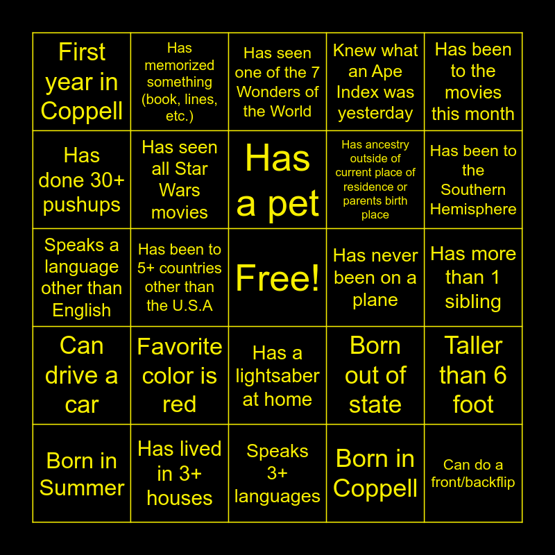 This bingo card has a free space and 24 words: Favorite color is red, Has lived in 3+ houses, Has a pet, Born in Summer, Has been to the movies this month, First year in Coppell, Has done 30+ pushups, Has memorized something (book, lines, etc.), Has never been on a plane, Has a lightsaber at home, Has ancestry outside of current place of residence or parents birth place, Speaks a language other than English, Born out of state, Taller than 6 foot, Has seen all Star Wars movies, Born in Coppell, Has more than 1 sibling, Has seen one of the 7 Wonders of the World, Has been to the Southern Hemisphere, Has been to 5+ countries other than the U.S.A, Can do a front/backflip, Can drive a car, Knew what an Ape Index was yesterday and Speaks 3+ languages.
