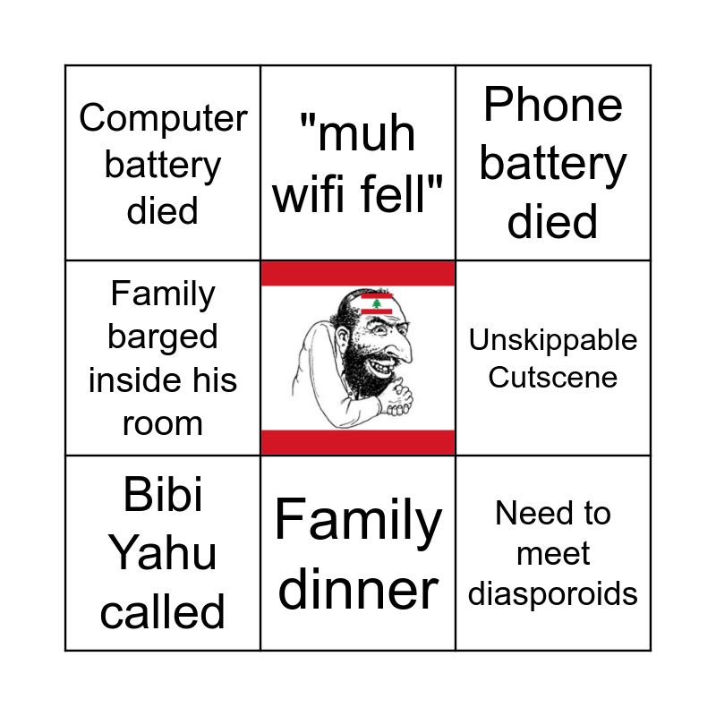 This bingo card has a free space and 8 words: Unskippable Cutscene, Phone battery died, "muh wifi fell", Bibi Yahu called, Computer battery died, Need to meet diasporoids, Family barged inside his room and Family dinner.