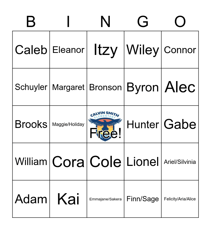 This bingo card has a free space and 31 words: Emmajane/Sakera, Andi, Maggie/Holiday, Jay, Caleb, Itzy, Margaret, Lionel, Hunter, Finn/Sage, Gabe, Felicity/Aria/Alice, Tristan, Rex, Alec, Makyna, Ariel/Silvinia, Cora, William, Cole, Connor, Hyrum, Adam, Eleanor, Byron, Schuyler, Wiley, Brooks, Kai, Bronson and Vienna.