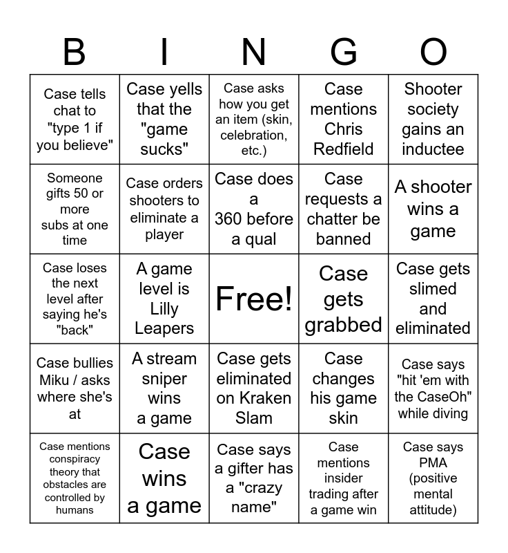 This bingo card has a free space and 34 words: Case says the doubters are (gonna be) "crynin'", Case mentions insider trading after a game win, Case claims he had a world record on a level, Case calls a player a "disgusting insect/animal", Case bullies Miku / asks where she's at, Case orders shooters to eliminate a player, Shooter society gains an inductee, Case mentions conspiracy theory that obstacles are controlled by humans, Case yells that the "game sucks", Case attributes his playing ability to his game skin, Case does a 360 before a qual, Case asks how you get an item (skin, celebration, etc.), Case asks the Fall Guys devs for a feature, Case says he's insane/unbelievable and gets eliminated in the same level, Case gets grabbed, A shooter wins a game, Case wins a game, Case loses the next level after saying he's "back", A stream sniper wins a game, Case changes his game skin, Case gets eliminated on Kraken Slam, Case is first to qualify, Case tells chat to "type 1 if you believe", Case gets slimed and eliminated, Case says a gifter has a "crazy name", Case says PMA (positive mental attitude), Case mentions Chris Redfield, Case requests a chatter be modded, Case requests a chatter be banned, Someone gifts 50 or more subs at one time, A game level is Blastlantis, A game level is Lilly Leapers, Case says "hit 'em with the CaseOh" while diving and Case picks a skin then says it sucks.