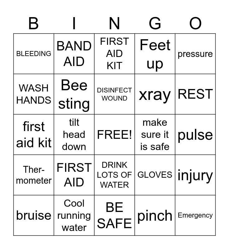 This bingo card has a free space and 24 words: FIRST AID, Cool running water, DISINFECT WOUND, bruise, pressure, BLEEDING, WASH HANDS, BAND AID, make sure it is safe, DRINK LOTS OF WATER, xray, first aid kit, GLOVES, injury, Bee sting, pinch, pulse, FIRST AID KIT, REST, tilt head down, Emergency, Ther- mometer, Feet up and BE SAFE.