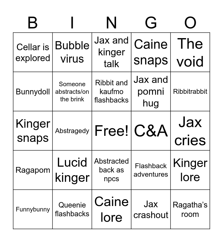 This bingo card has a free space and 24 words: Lucid kinger, Queenie flashbacks, Ribbit and kaufmo flashbacks, Funnybunny, The void, Cellar is explored, Bunnydoll, Bubble virus, C&A, Abstracted back as npcs, Jax and pomni hug, Kinger snaps, Flashback adventures, Kinger lore, Someone abstracts/on the brink, Jax crashout, Jax cries, Jax and kinger talk, Ribbitrabbit, Abstragedy, Ragatha’s room, Ragapom, Caine snaps and Caine lore.